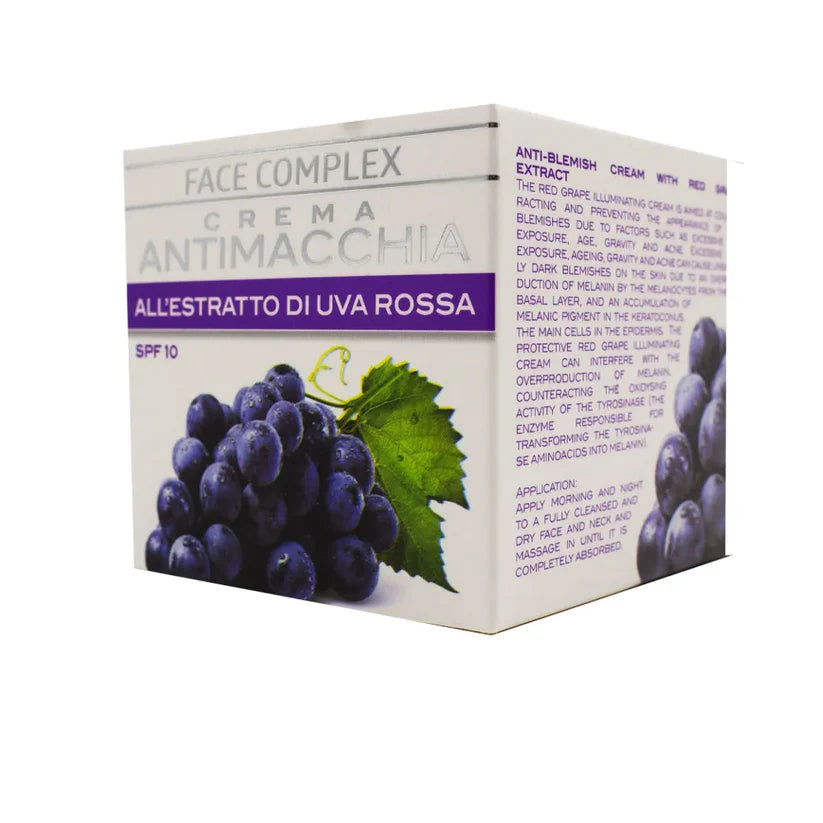 Prova la nostra Face Complex crema antimacchia con estratto di uva rossa. Riduce le macchie scure e uniforma il colorito della pelle. Confezione da 50ml per una pelle più luminosa e giovane. Prodotto ideale per un viso impeccabile.